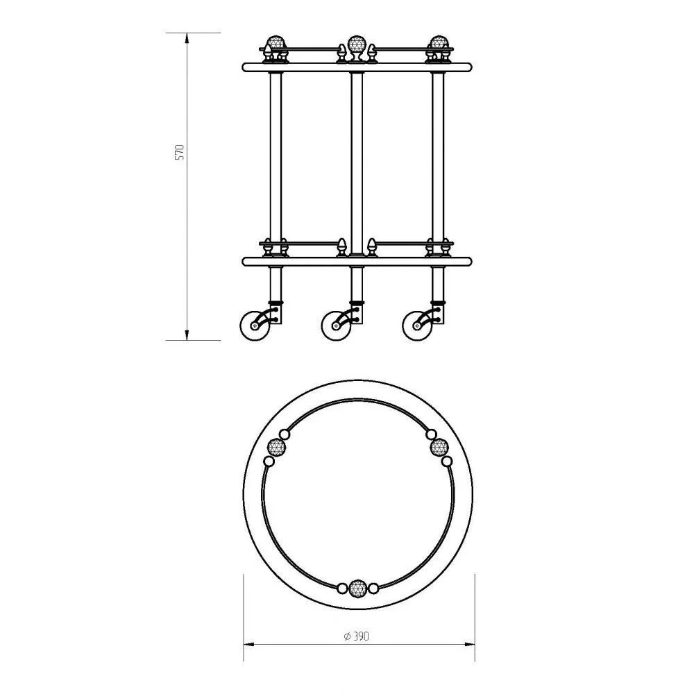 - Столик на колесах, две круглые полочки выполнены из высококачественного стекла с изящным латунным обрамлением по периметру.