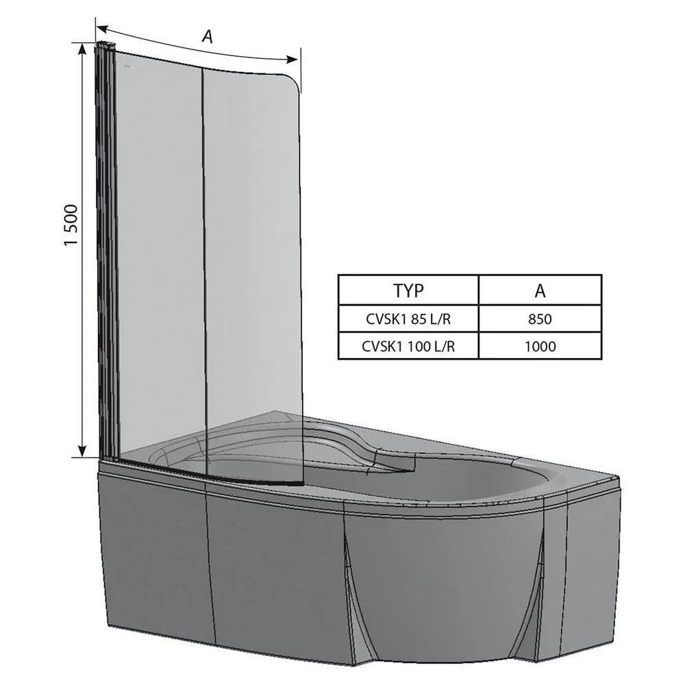 Размер: 85 cм. (для ванн 140/150); 100 cм. (для ванн 160/170); высота изделия 1500 мм.,