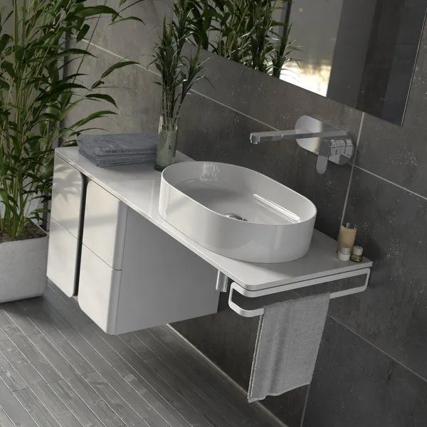 - Если столешница размещена над подвесной тумбой с одной стороны, необходимо с другой стороны дополнительная поддержка с помощью консоли Balance / Comfort 1200. Под столешницей также можно прикрепить полотенцедержатель Balance.