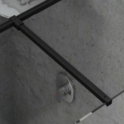 Устойчивость душевого ограждения обеспечивается нижним фиксатором стекла и верхним металлическим держателем с Т-соединением в исполнении цвет «блестящий» или черный.