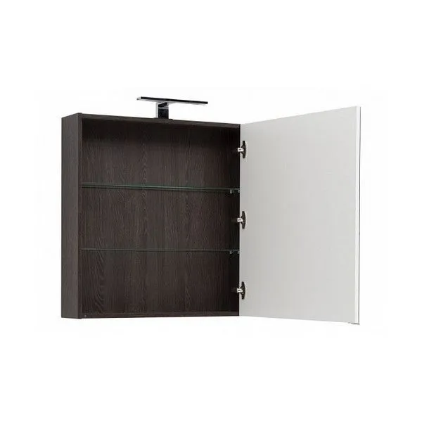 Зеркало-шкаф Aquanet Остин в цвете "дуб кантербери" выглядит стильно и необычно за счет яркого контраста между шоколадным корпусом и загадочным блеском зеркального фасада. Зона хранения внутри шкафчика шириной 65 см поделена на три полочки, две из которых стеклянные, что придает легкость. Зеркальный шкафчик станет настоящим украшением интерьера, выполненного в любом стиле. Представленный на фото светильник в комплект не входит. Его можно выбрать из числа предложенных.
