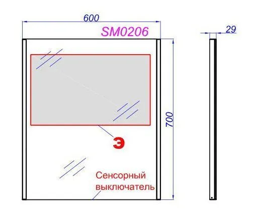 • Зеркало оборудовано выключателем с датчиком движения. Датчик движения находится по центру.