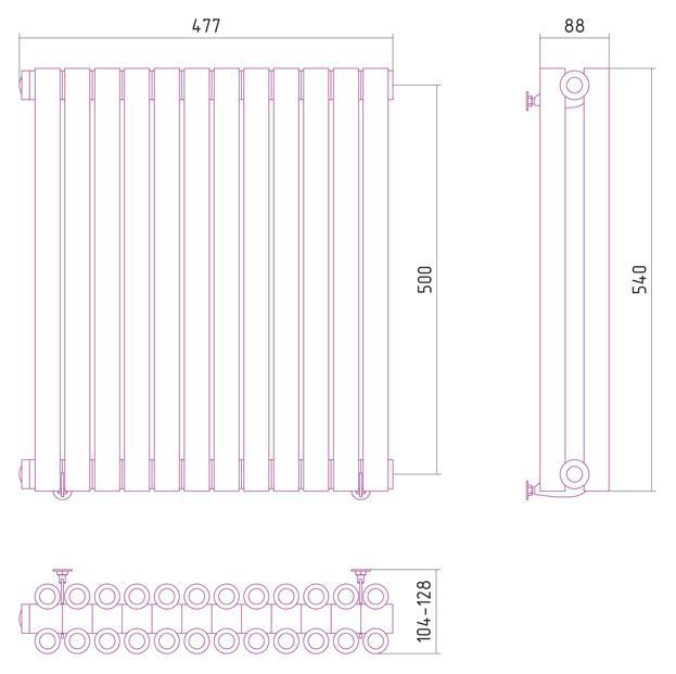 - Внешние габариты (высота х ширина х глубина) (мм)540х477х104-128