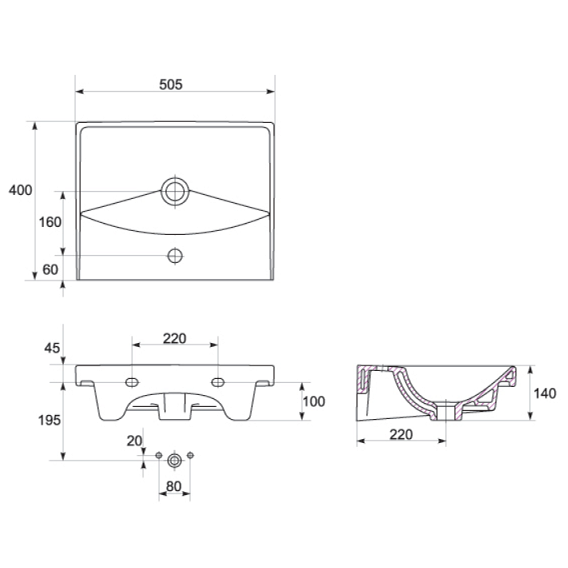 - Раковина встраиваемая: CITY 50, 1 отверстие, белый