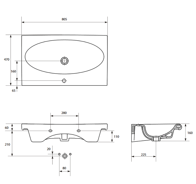 - Раковина встраиваемая: NATURE 80, 1 отверстие, белый