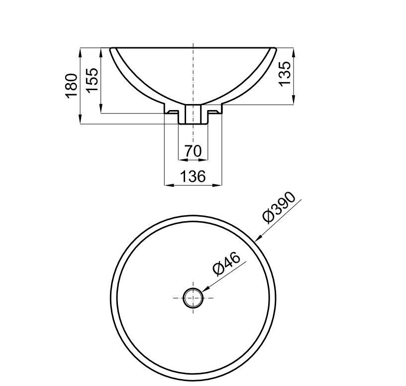 - Раковина круглая Ø40см с опорой, без слива. Рекомендуем использовать открытый донный клапан сливной клапан или решетку