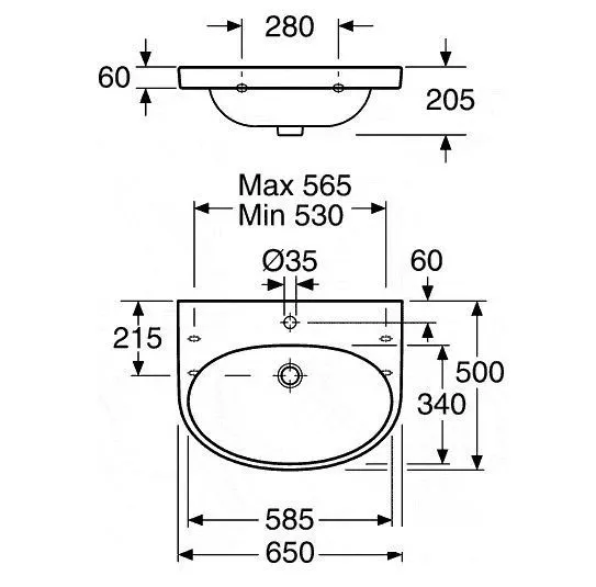 Раковина для установки на болтах/кронштейнах(240мм), 650 x 500 мм