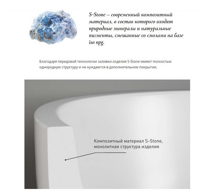 • S-Stone – современный композитный материал, в состав которого входят природные минералы и натуральные пигменты, смешанные со смолами на базе iso npg.