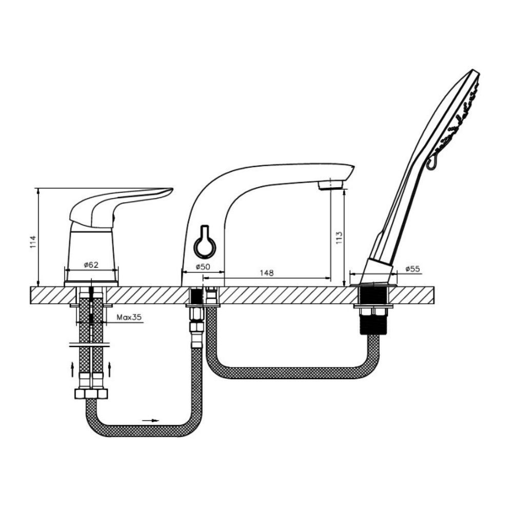 - Трёхсекционный смеситель Agger A3333300 предназначен для установки на борт ванны или подиум под неё.