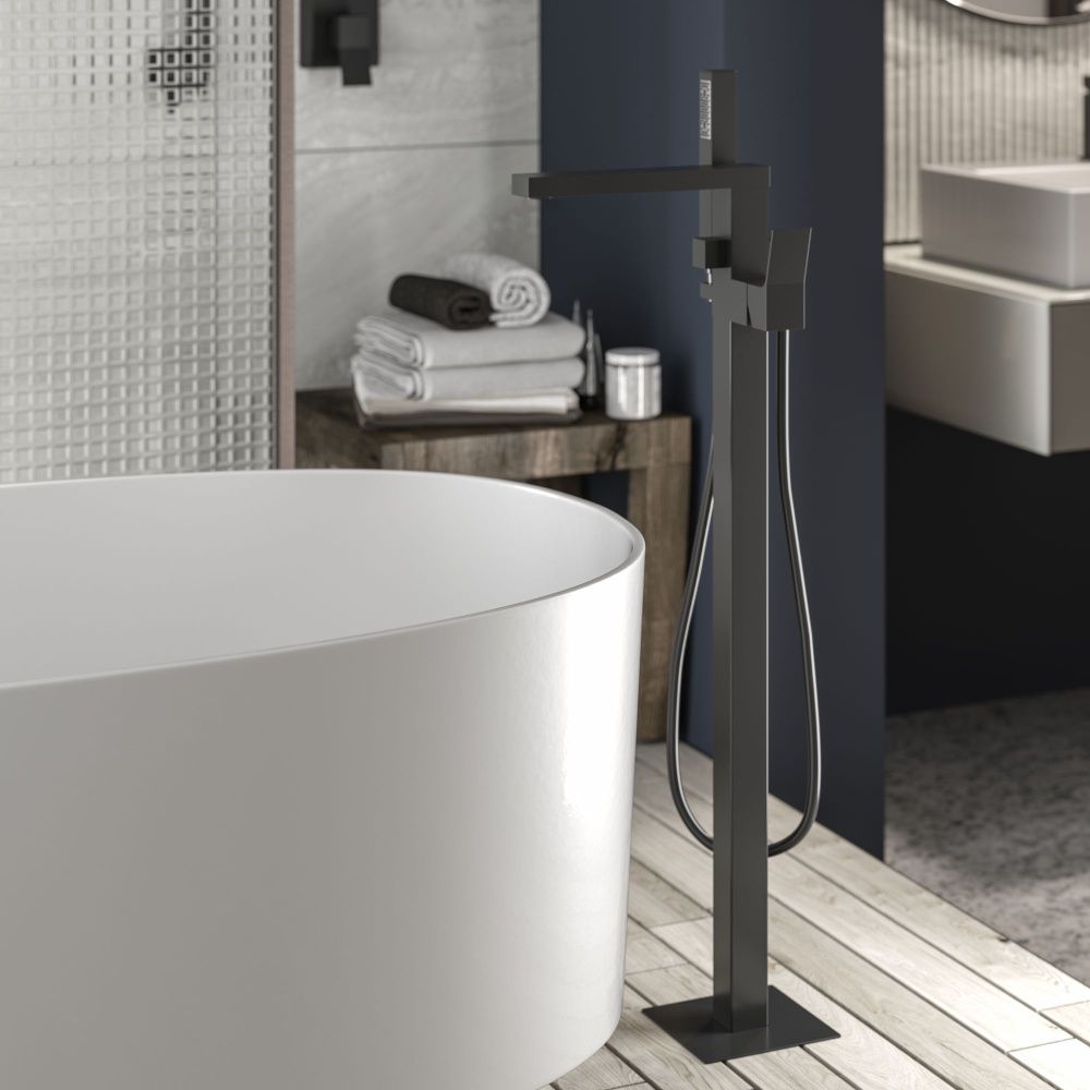 Смеситель для ванны напольный однорычажный, со шлангом 125 см и лейкой Cube, черный матовый (073)