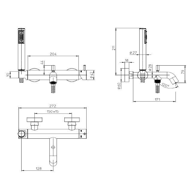 Смеситель для ванны настенный со шлангом 125 см и лейкой Zen, хром (030)