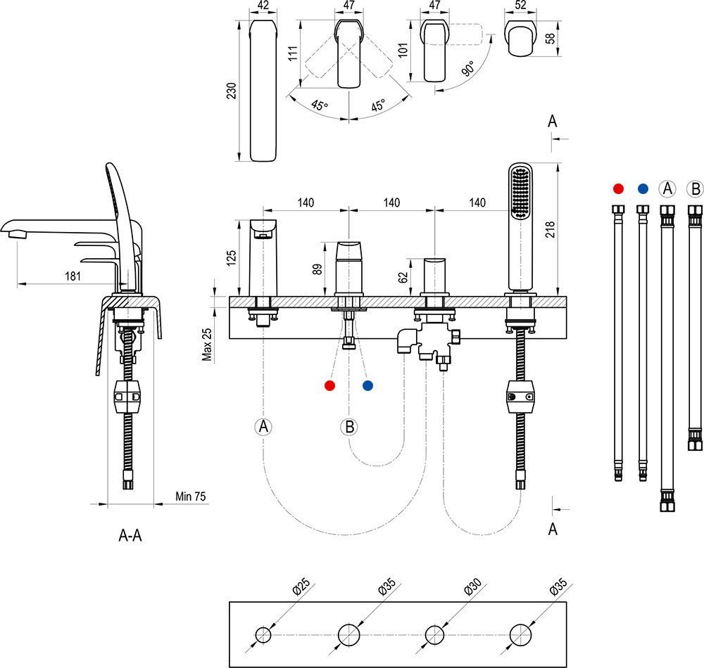 • Врезной в борт смеситель с четырьмя отверстиями Flat подходит для установки в борт ванны.