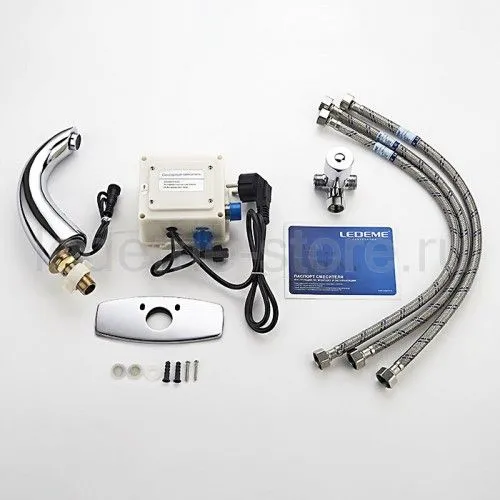 Сенсорный смеситель Ledeme L1055-14 – модель нового поколения. В конструкции отсутствуют привычные рычаги или вентили. В поле зрения только литой гусак, под корпусом которого монтирована электронная система управления. Поэтому внешне модель смотрится намного интересней классических аналогов. Процедура эксплуатации смесителя тоже нестандартная. Управлять потоком воды следует, не прикасаясь к корпусу девайса, а просто поднося к нему руки. Эта особенность обеспечивает безупречную гигиеничность и комфортные условия для использования прибора по назначению.