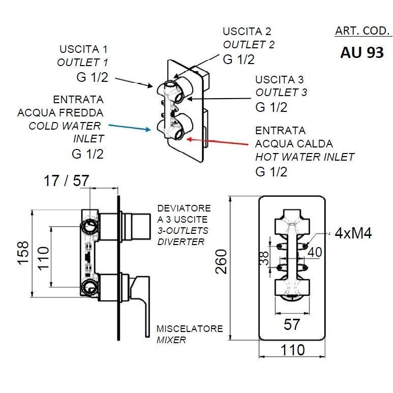 - Смеситель для ванны встраиваемый (хром). Однорычажный смеситель скрытого монтажа с переключателем потока. Три выхода.