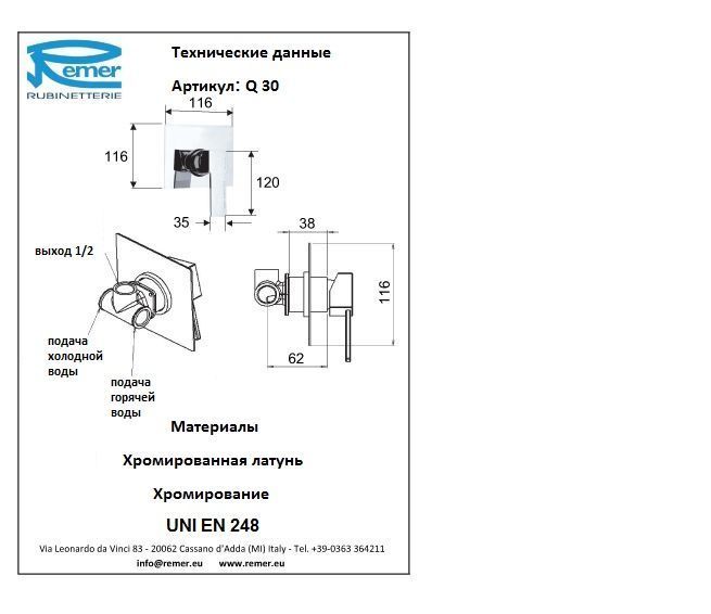 Смеситель Remer Qubica Q30 для душа/ванны, хром