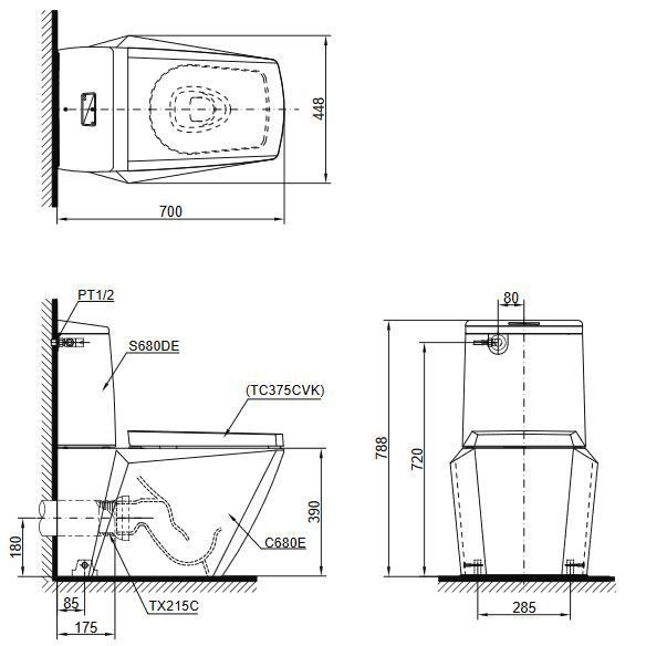 - TOTO Jewelhex Унитаз моноблок, 448x700x390, без бачка (подходит: SWN680B#W), гориз отвод, без сиденья (подходит: TC375CVK#W), CeFiONtect, цвет: белый