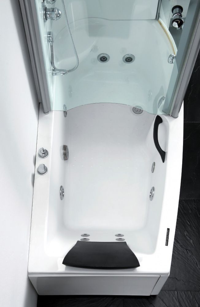 - вертикальный гидромассаж 6 форсунок, полочка, зеркало, смеситель с изливом, верхний душ, лейка