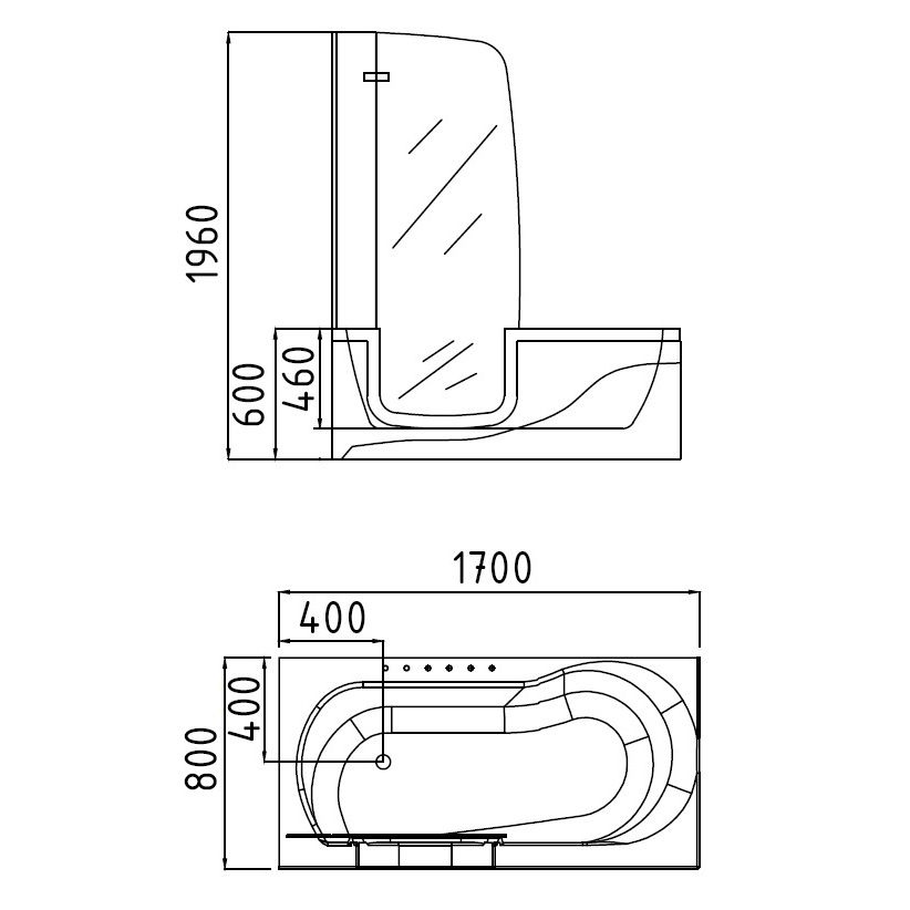 - Размеры: 196х170х80 см. В комплекте каркас, смеситель с изливом, душевая лейка, слив-перелив.