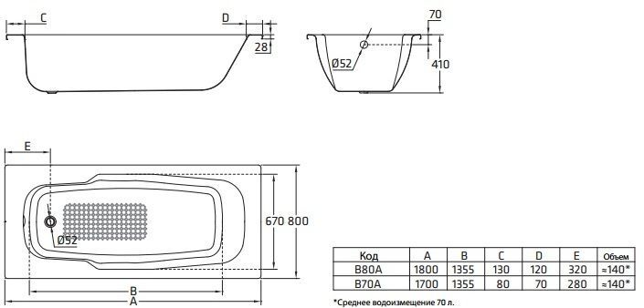 Хромированные ручки, эмалевое антискользящее покрытие, отверстия для смесителей, звукоизоляционный комплект.