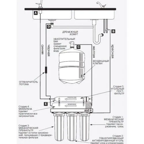 - 1-я ступень: механический префильтр для частиц крупнее 5 мкм (на выбор: Atoll МП-5, Waterpik IR-20, Pentek P5, Pentek CW-F)