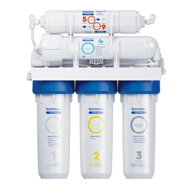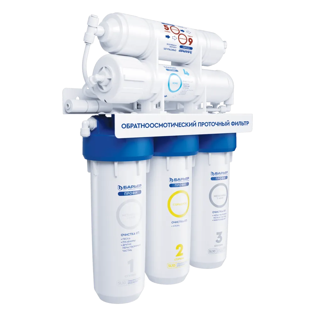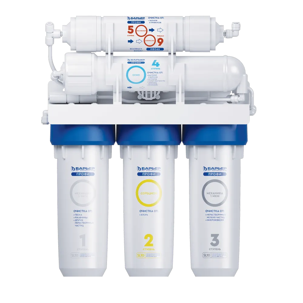 Система очистки воды с обратным осмосом БАРЬЕР ПРОФИ Осмо 100, Н151Р01 в корпусе классического исполнения. Вода проходит пять этапов очистки, что позволяет удалить все примеси и получить кристально чистую воду, не уступающую по качеству бутилированной: